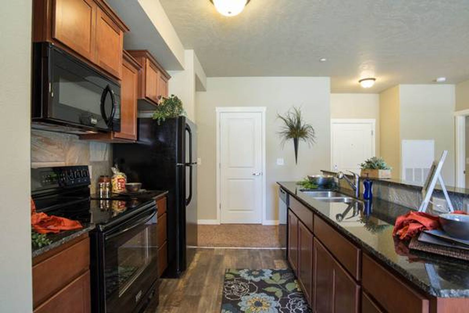Our custom interiors include granite rough edge countertops, stainless steel in-set sink, retractable kitchen faucet, custom cabinetry, carpet with 8lb pad, warm interior paint, large windows with natural light, black on black appliances with flattop cook range, icemaker, front Loading washer/ dryer, private patio or balcony with storage, and an abundance of closet space.