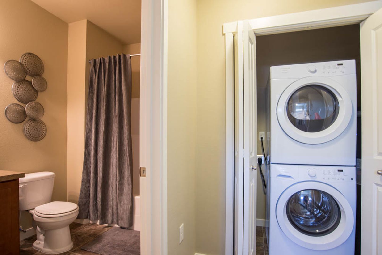 Our custom interiors include granite rough edge countertops, stainless steel in-set sink, retractable kitchen faucet, custom cabinetry, carpet with 8lb pad, warm interior paint, large windows with natural light, black on black appliances with flattop cook range, icemaker, front Loading washer/ dryer, private patio or balcony with storage, and an abundance of closet space.