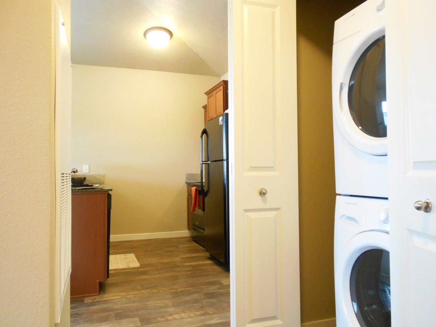 Our custom interiors include granite rough edge countertops, stainless steel in-set sink, retractable kitchen faucet, custom cabinetry, carpet with 8lb pad, warm interior paint, large windows with natural light, black on black appliances with flattop cook range, icemaker, front Loading washer/ dryer, private patio or balcony with storage, and an abundance of closet space.
